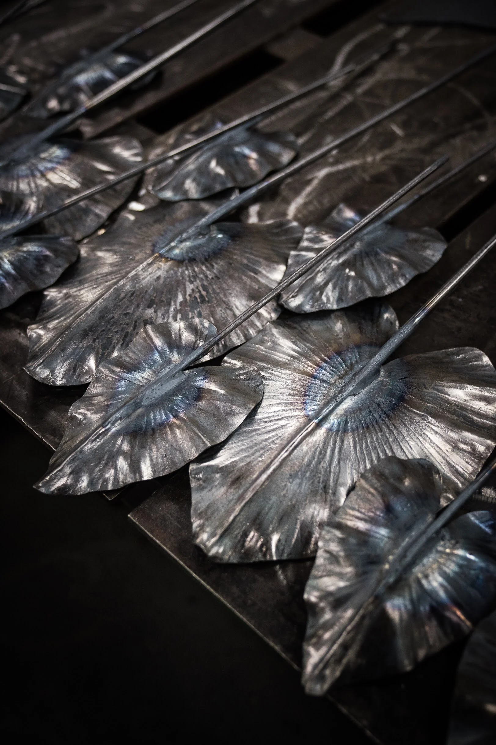 In November 2018 designer Amy Meier contacted David and asked him if he would be willing to help design a piece for her space in the 2nd annual Kips Bay Show House in West Palm Beach, FL. The concept was to create an art nouveau style fireplace mantle that focused on organic life forms native to the Palm Beach area. David’s signature leaves, frogs, turtles and crane were used on several pieces throughout the space. The pieces include a mantle with crane & taro leaves in the dining area, a steel daybed with frogs, turtles and a taro leaf canopy, and two steel lily-pad side tables with bronze turtles and frogs.